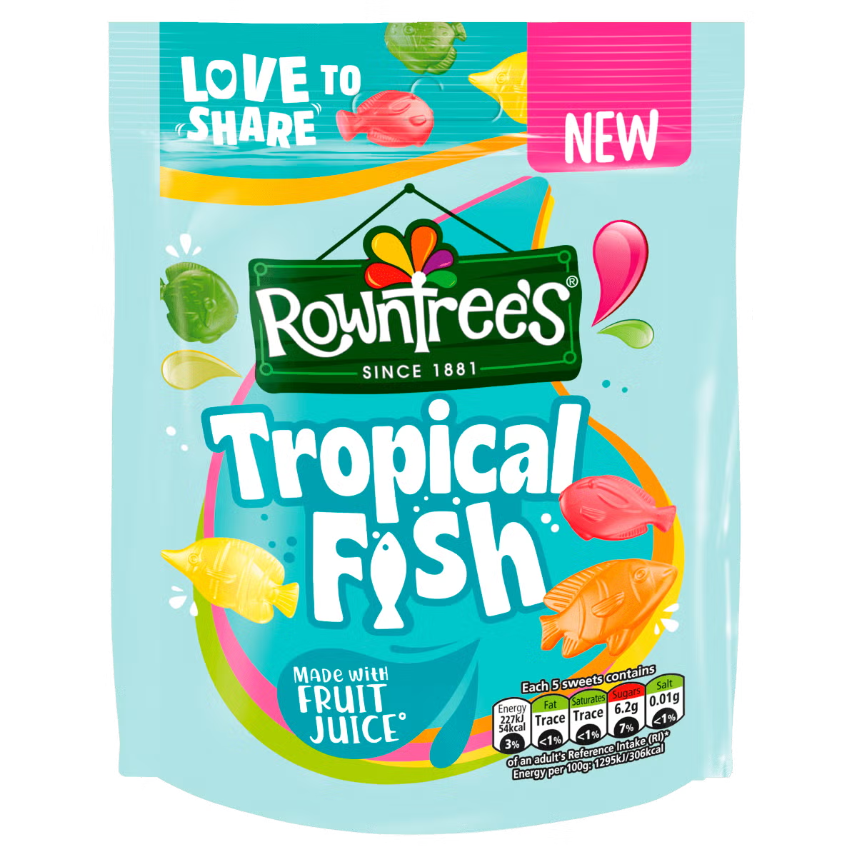 Product descriptionJuicy sweets shaped like tropical fish in four flavors: mango, peach, kiwi and mandarin.