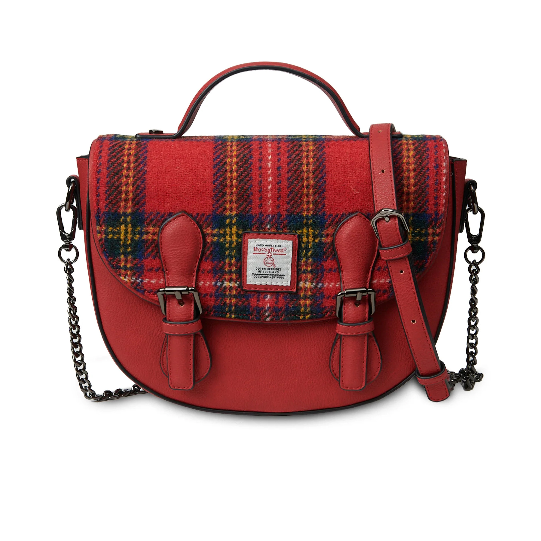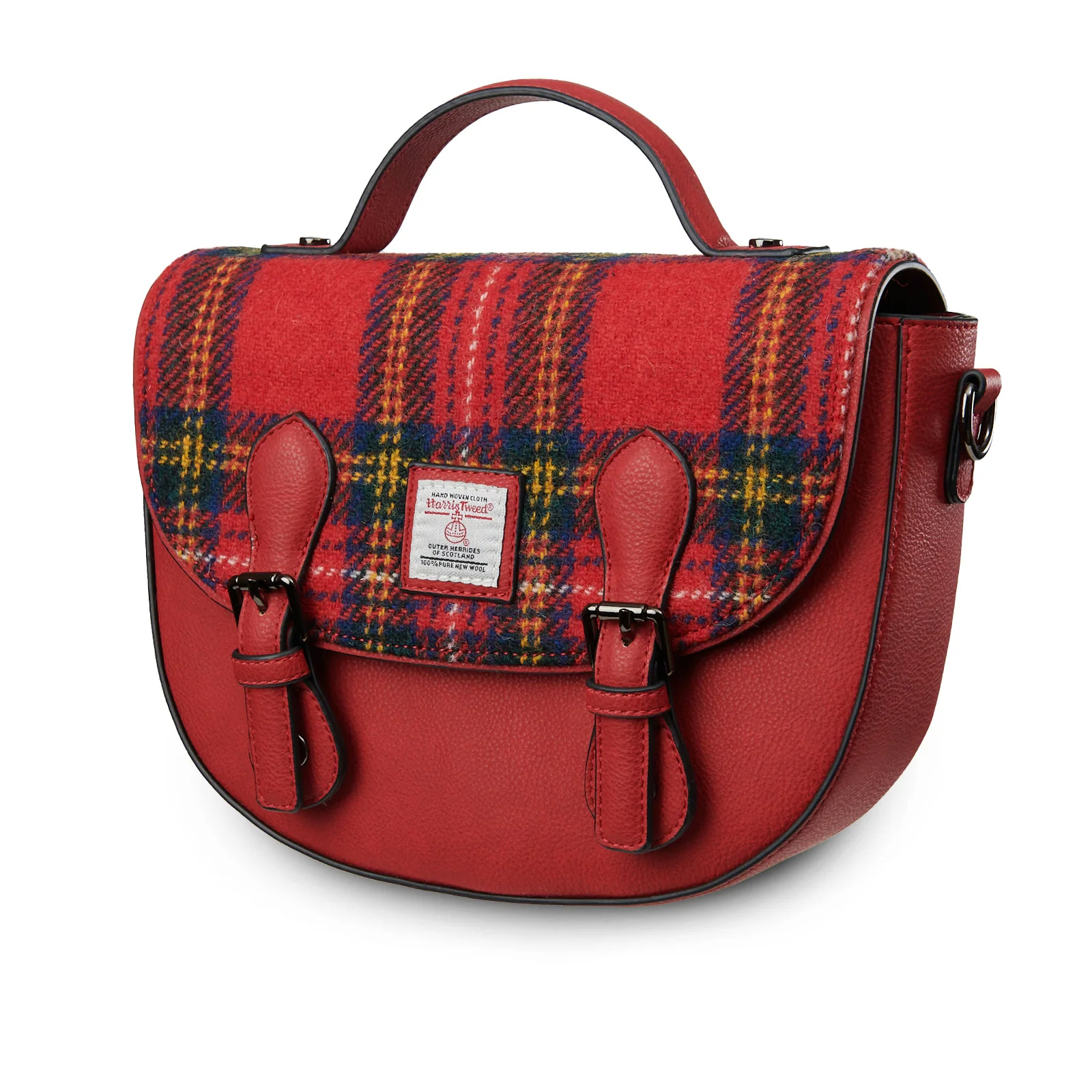 The Islander UK Medium Cobble Satchel in Royal Stewart Tartan is a stylish, durable handbag blending traditional Scottish Harris Tweed handwoven wool from Outer Hebrides with modern vegan leather, featuring an adjustable strap, internal and external zip pockets, and a secure magnetic clasp for carrying essentials with a blend of heritage and contemporary flair.
