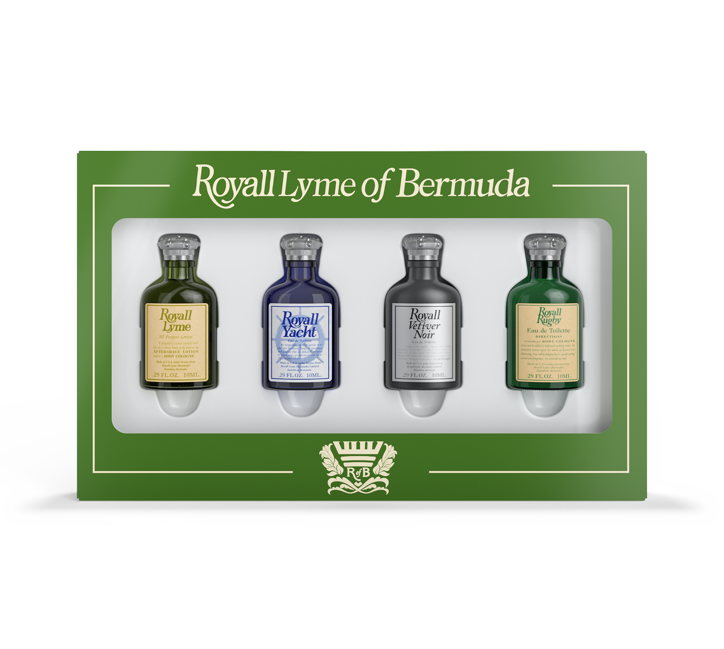 Contains four 10ml bottles: Royall Lyme, Royall Yacht, Royall Vetiver Noir and Royall Rugby.