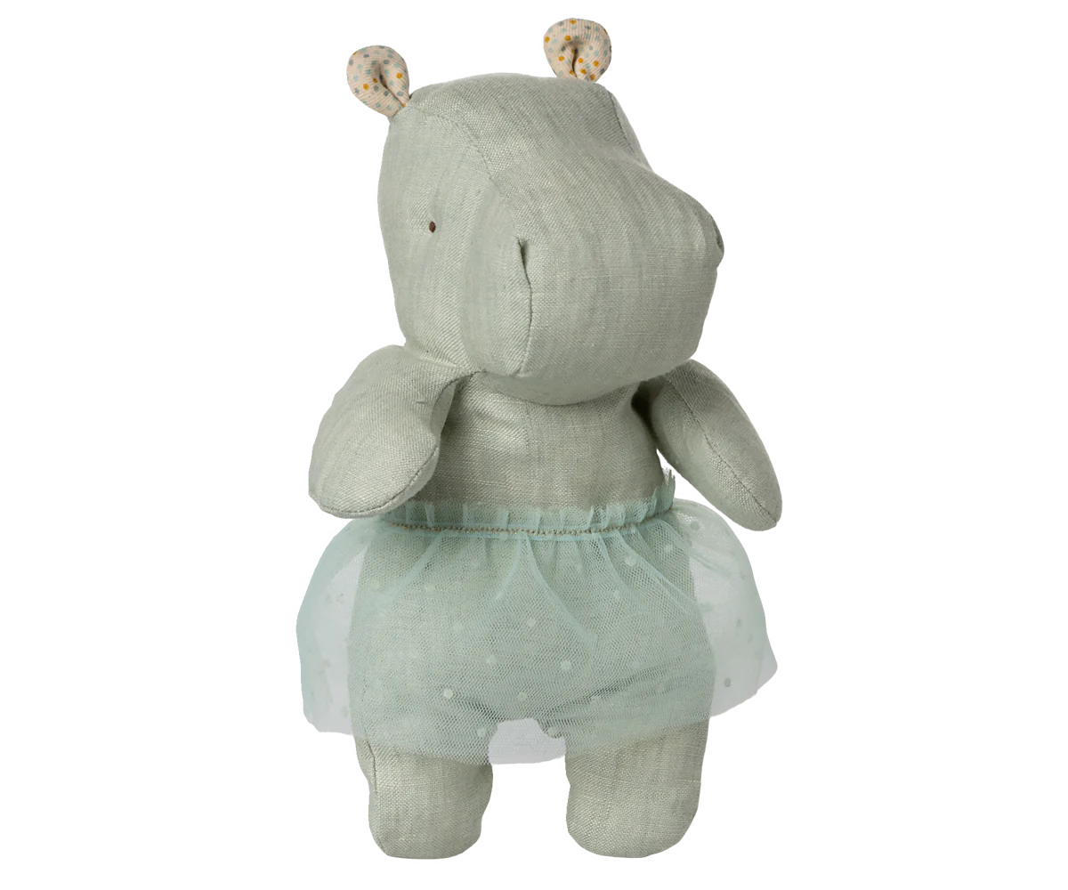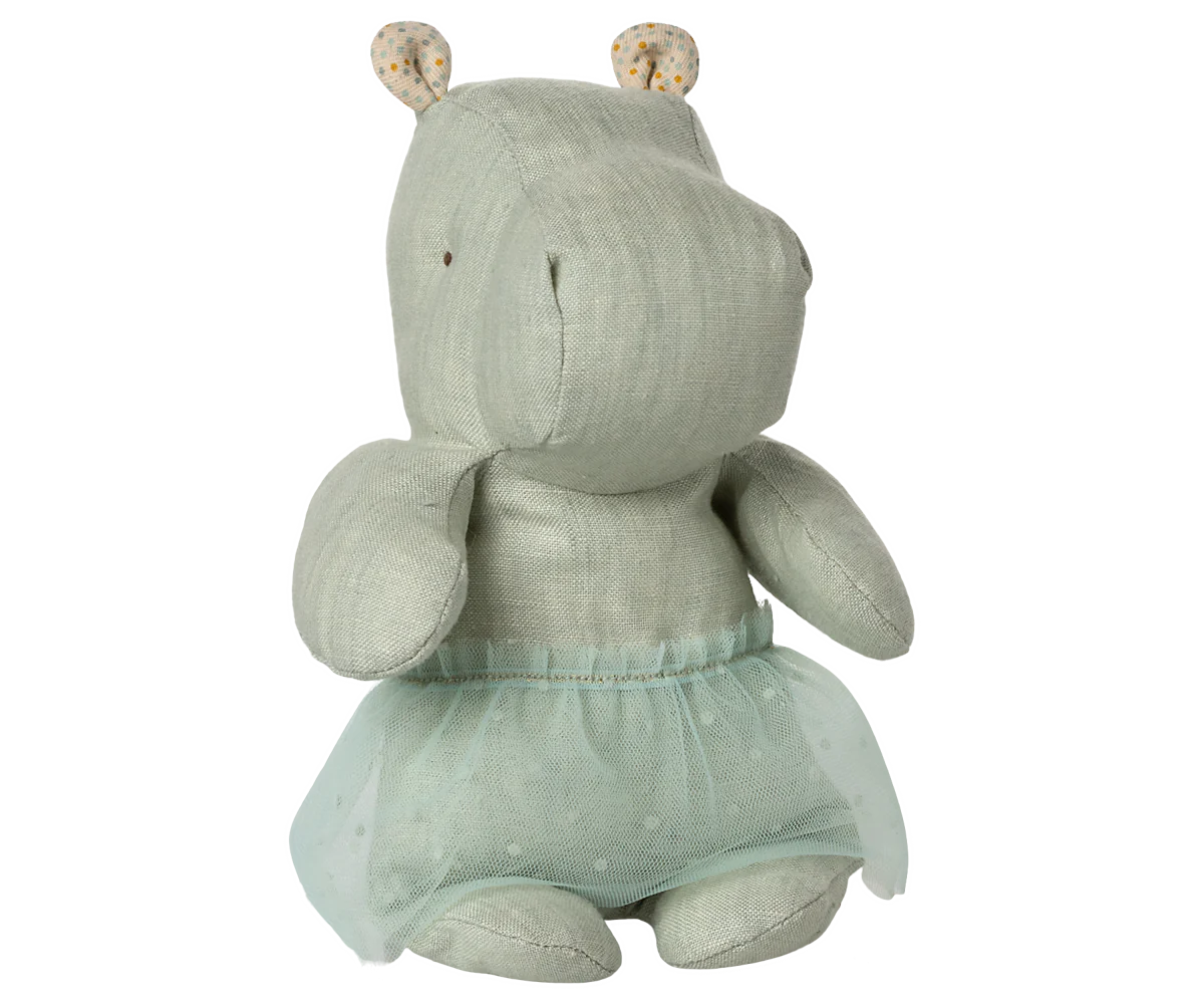 Safari friends are made in the softest fabric and come in great colors. They can sit by themselves as they have beans in their bottom. They are just waiting for you to come and hug them. This small hippo is wearing a beautiful ballerina skirt.