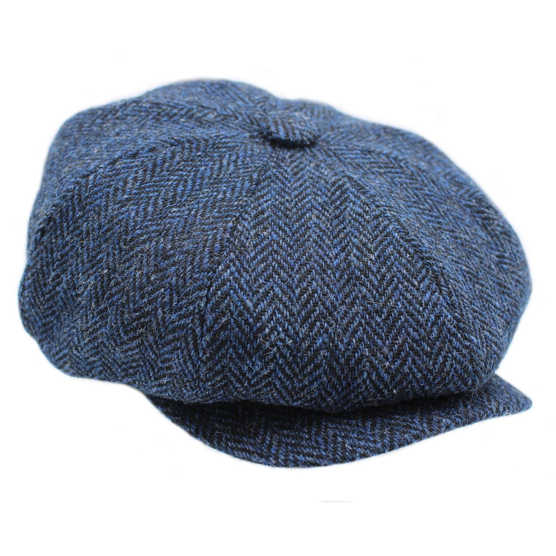 This traditional newsboy 8-piece cap by Heather Hats is made from genuine Harris Tweed with a central button, ''Peaky Blinders'' style, and comes in a blue-and-black herringbone pattern. This panelled Harris cap boasts an elongated peak and has quilted satin lining. The peak is fully stitch attached, preventing the cap being worn with the upper portion detached, and this ensures the shape is maintained over time.