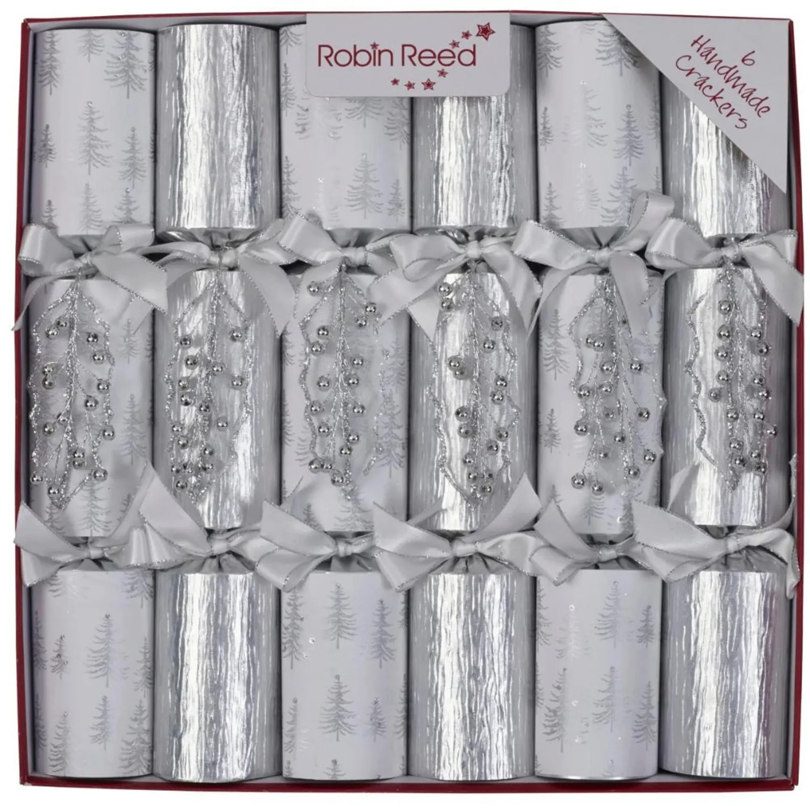 Robin Reed Silver Ice Christmas Crackers are traditional, handmade English Christmas crackers featuring a decorative silver trees design with ribbons and trim, complete with party favors inside. Pull apart with a friend to reveal a bang, a paper crown, a joke, and a small piccadilly gift.