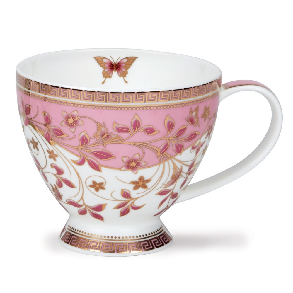 This mug has a modern and elegant design of a gently flowing pattern of pale pink flowers and foliage with bright 22-carat gold detailing over a soft pink background.