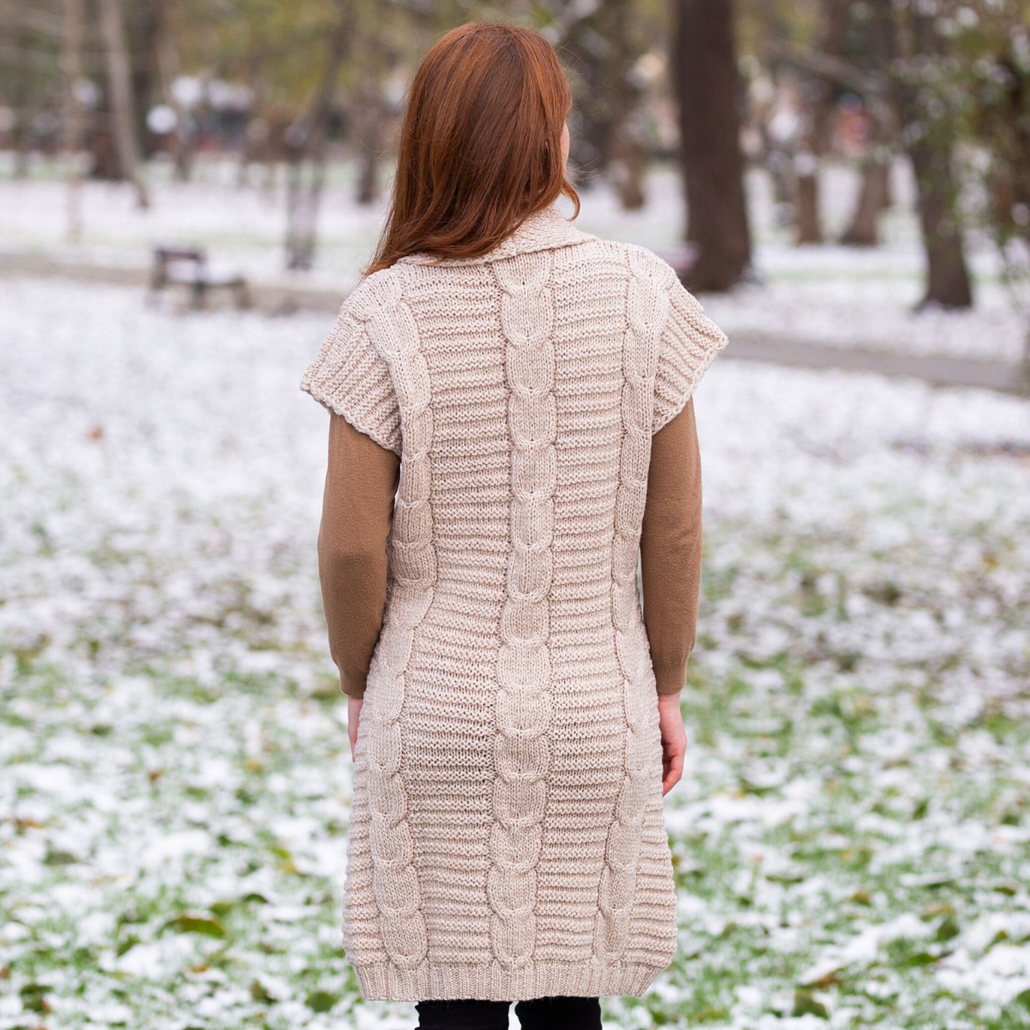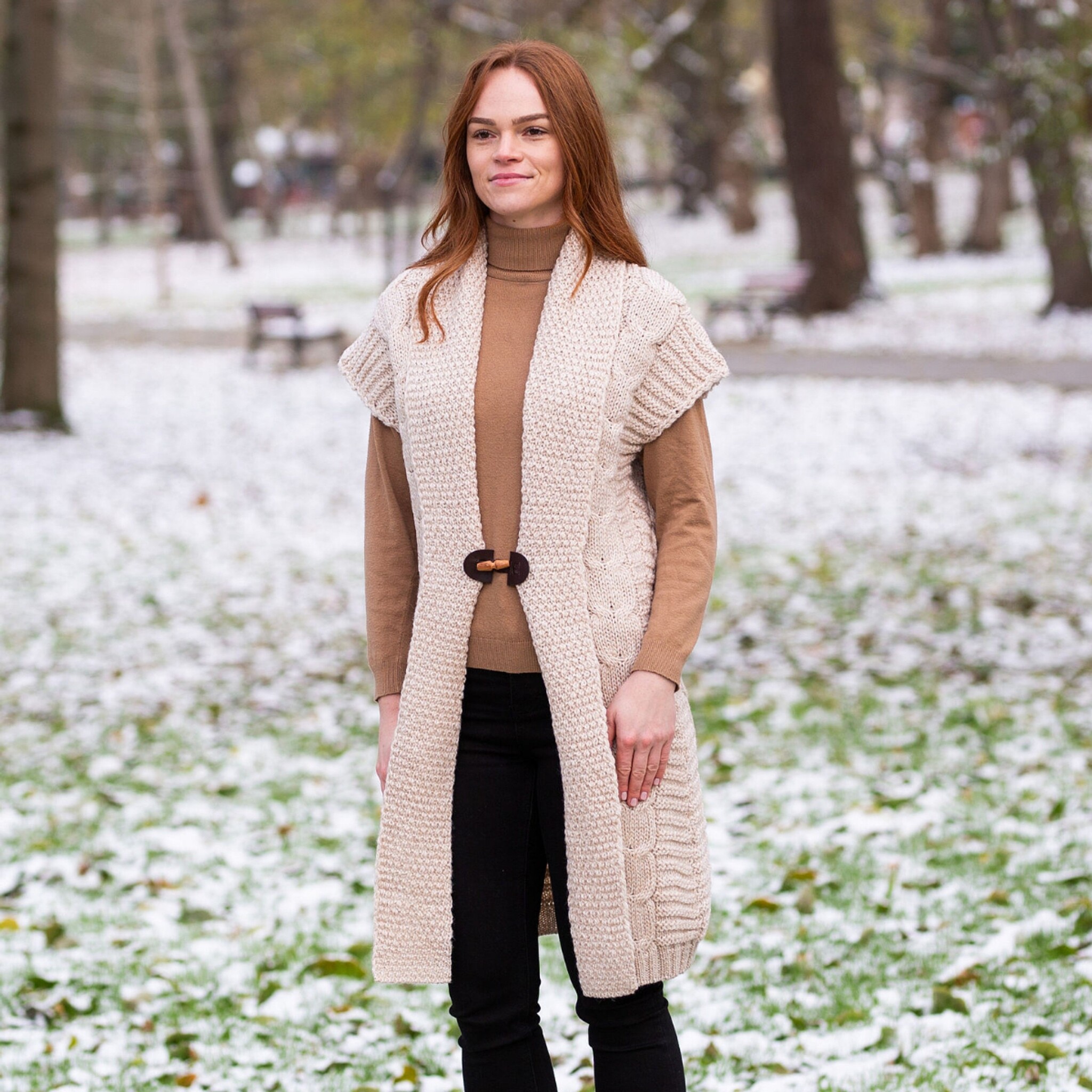 This cardigan's Aran-inspired design incorporates two of the most popular stitches: the cable stitch is a timeless classic, reminiscent of the ropes used by Irish fishermen, and the moss patterns are associated with natural beauty, resembling the moss found on Ireland's cliffs.