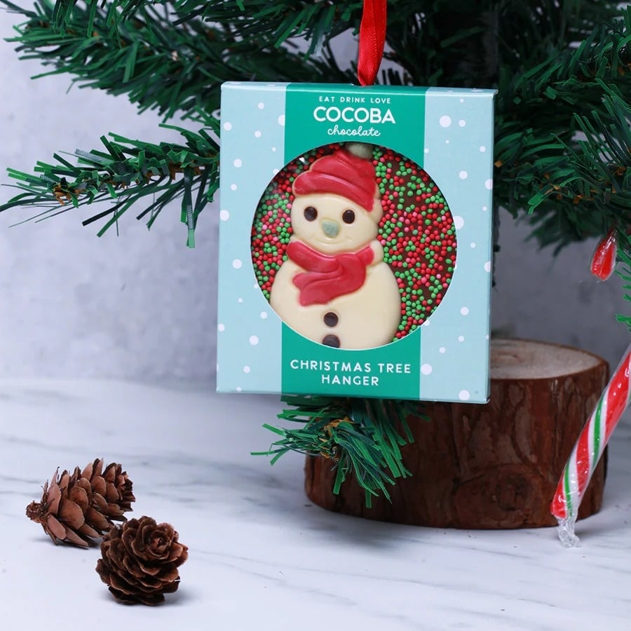 Deck the halls with delicious Cocoba chocolate. The Snowman Christmas Tree Hanger is made from a square of smooth milk chocolate topped with green and red sugar sprinkles, and finished with a sweet Snowman character to make a loveable gift for the tree.