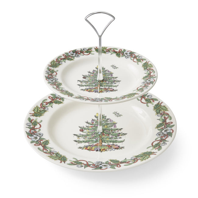 Featuring the iconic Spode Christmas Tree on a wreath, surrounded by holly, red roses, and ribbons, this tiered cake stand is a nostalgic, classic holiday centerpiece for desserts, cakes, and other treats. Hand wash. Made in England. British Isles is a registered Spode stockist.