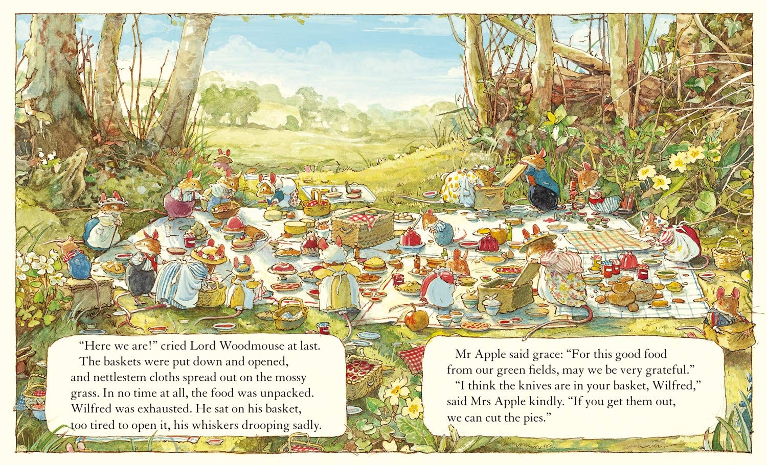 Wilfred woke early. It was his birthday. He had lots of lovely presents, but the best one was a surprise—Mr. Apple had organised a secret celebration picnic, and all the mice of Brambly Hedge were invited.