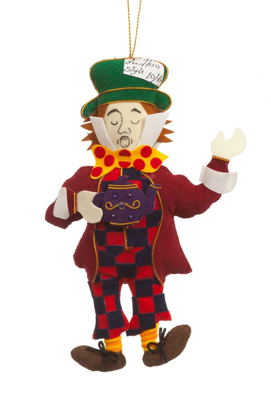 This handmade Mad Hatter ornament features detailed embroidery in an homage to Alice in Wonderland.