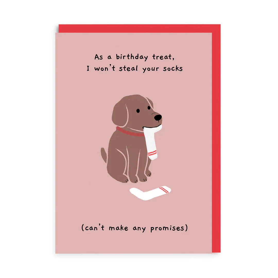 Front reads: As a birthday treat, I won't steal your socks (can't make any promises)