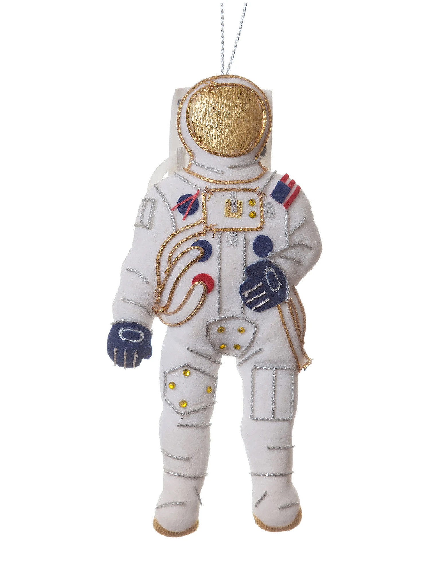 This handmade U.S. astronaut ornament features detailed embroidery and beadwork.