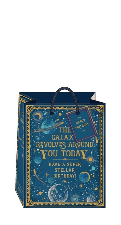 This birthday gift bag is out of this world. It features gorgeous foiling and includes woven paper handles and a matching tag. It is produced from sustainable forests.