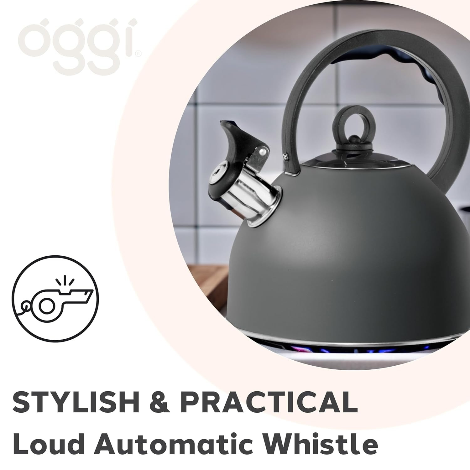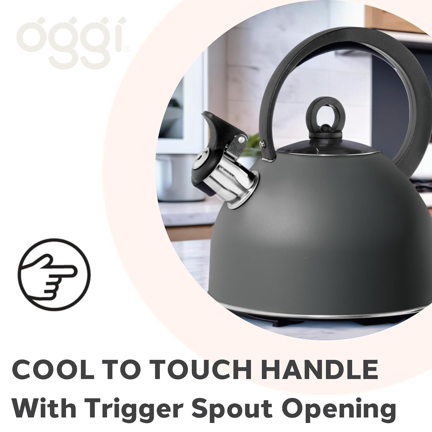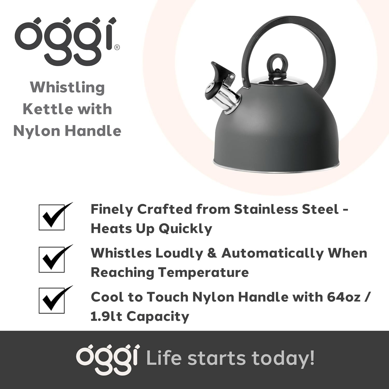 The OGGI Whistling Tea Kettle in a classic black uses professional food-grade stainless steel and is built with the finest craftsmanship to ensure it is corrosion-resistant and heats up quickly even on a medium heat. Stovetop kettles need to be heard, and this stove kettle has a loud and automatic whistle to grab your attention even in a noisy kitchen. The cool-to-touch nylon handle with a trigger-operated spout cover makes it safe and easy to use. Suited for induction, electric, and gas stovetops.