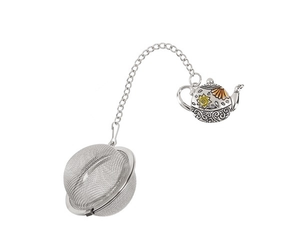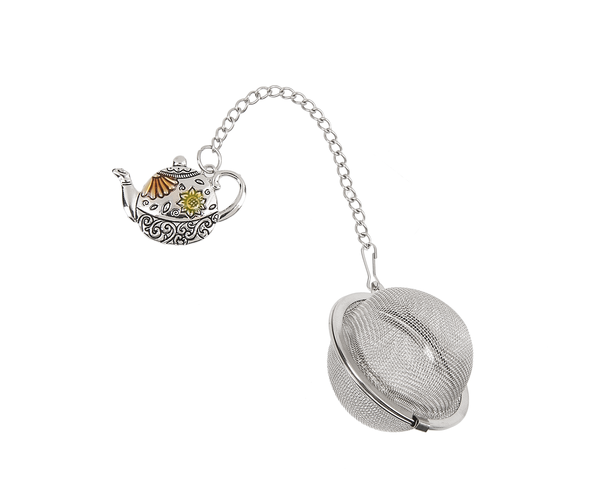 This metal tea ball, designed for steeping loose-leaf tea, features a sunflower-painted enamel teapot charm at the end of its chain. This charming and functional infuser is used for brewing a single cup of tea.