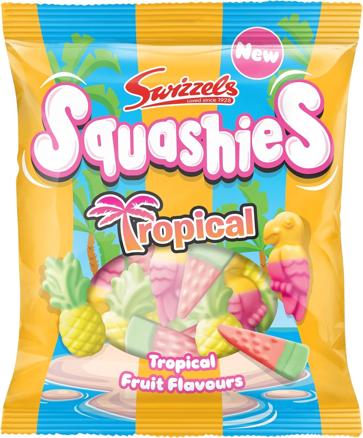 Swizzels Tropical Squashies are soft, foamy, chewy sweets bursting with exotic fruit flavors like mango and passionfruit, pineapple, and watermelon, molded into fun shapes like parrots, pineapples, and watermelons.