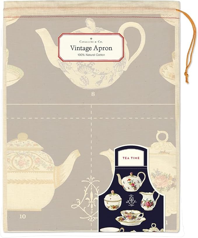 The Cavallini & Co. Tea Time Apron is a 100% natural cotton, vintage-style apron featuring colorful archival tea-themed imagery. Designed for functionality and style, it features an adjustable neck strap with a wooden button, a long waist tie, and a divided front pocket and comes in a muslin drawstring bag. Machine washable.