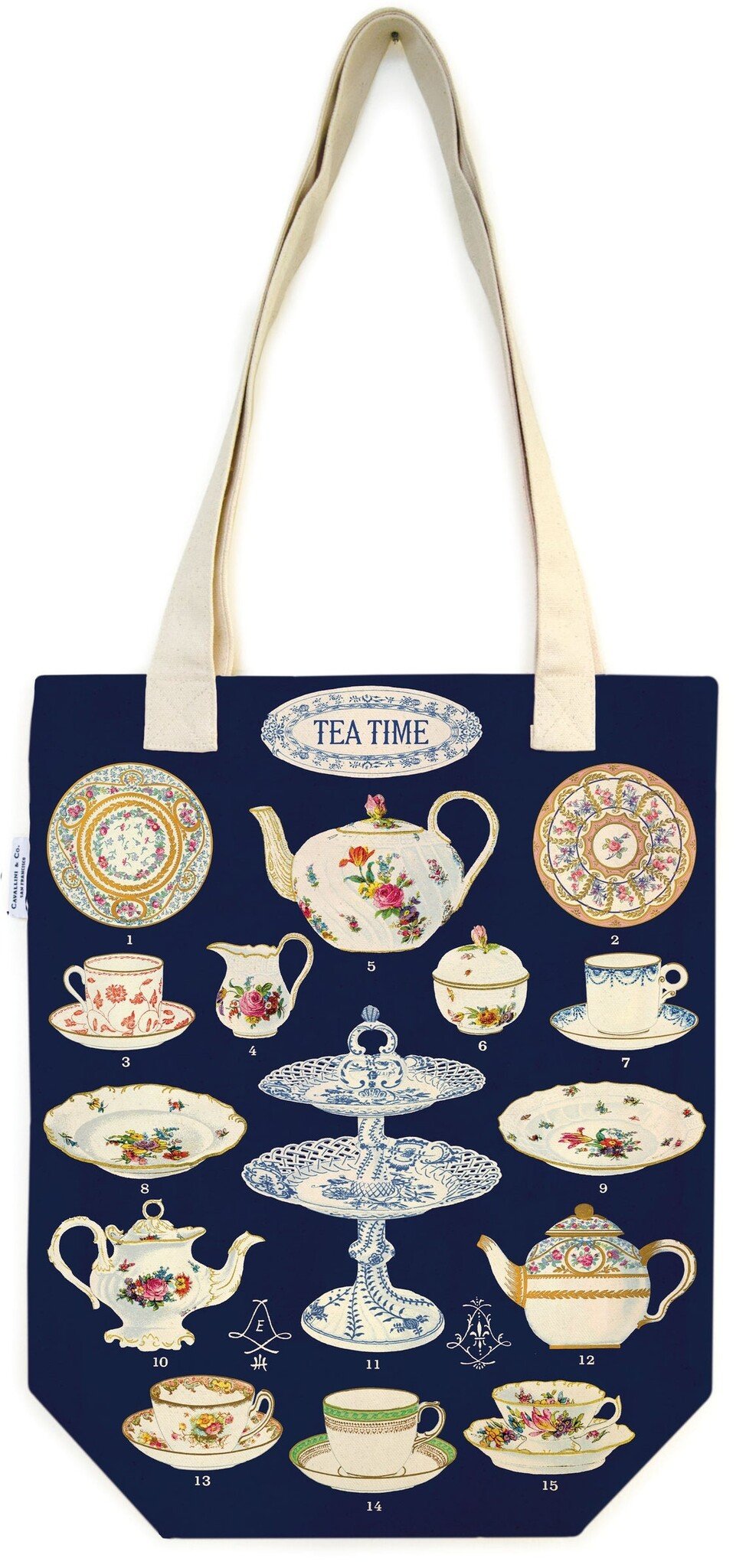 The Cavallini & Co. Tea Time Tote Bag, made from 100% natural, heavyweight cotton canvas, features a vintage tea set design. Featuring a dark blue background with various tea cups and saucers, it's ideal for shopping and errands, and its small internal pocket for organization is perfect for keys and a wallet.