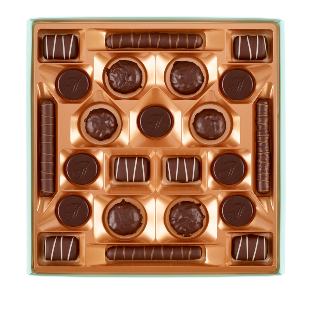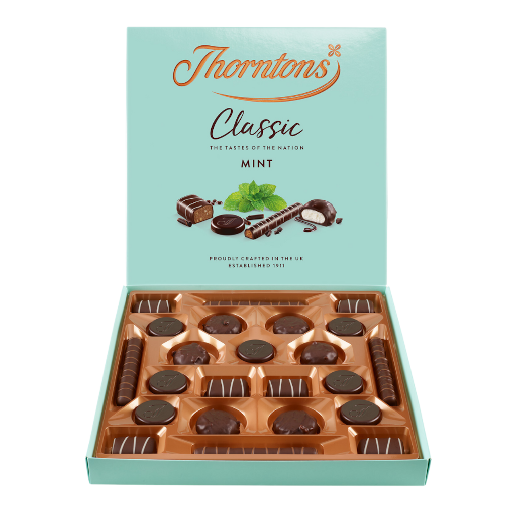 This delicious assortment contains rich, captivating dark chocolate combined with cool, crisp peppermint, ideal as a gift or an after dinner treat… from Mint Batons — a dark chocolate peppermint truffle with little crispy honeycomb pieces — to the Luxury Dinner Mint — a blend of double cream and peppermint smothered in rich dark chocolate.