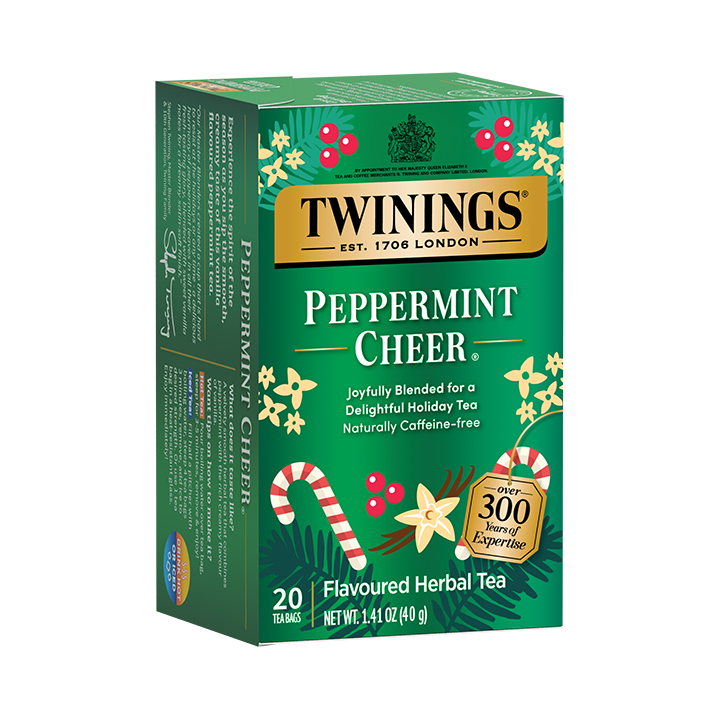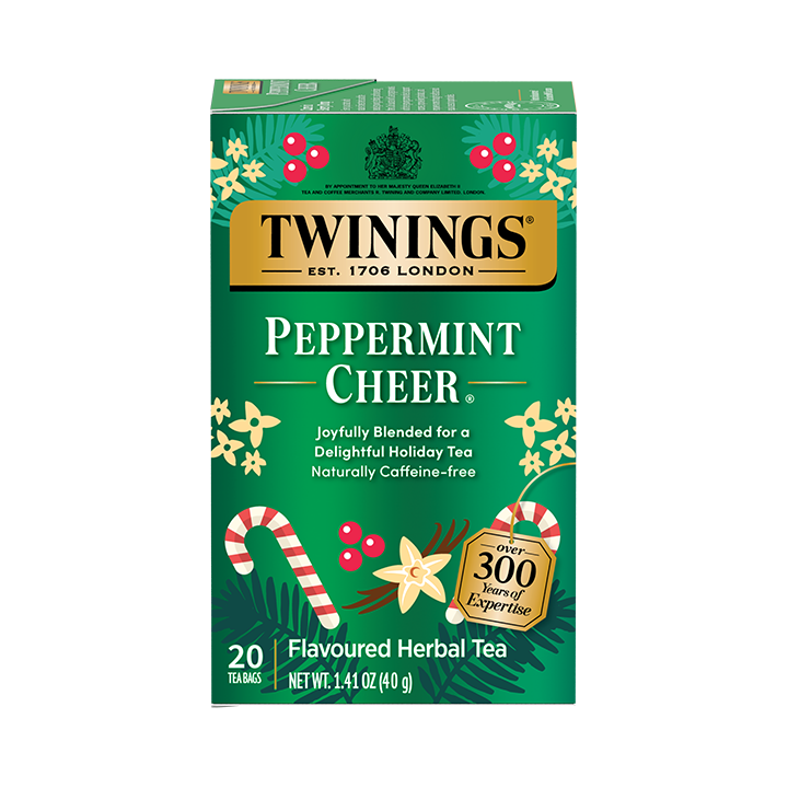 Celebrate the season with this vanilla-flavored peppermint tea's smooth, creamy taste. Twinings delightfully offers this special edition winter tea that celebrates the joy and spirit of the holiday season. Peppermint Cheer is a velvety smooth blend that combines refreshing peppermint with vanilla's rich, creamy flavor.