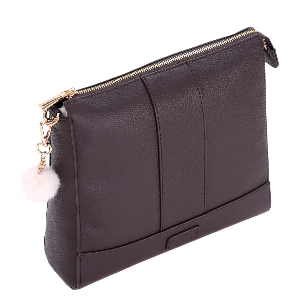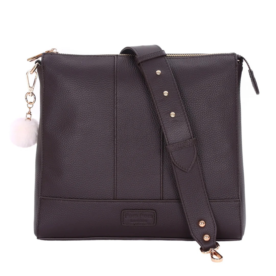 It features an internal zip side pocket, open side pockets for easy organization, fabric lining, and Pom Pom London’s iconic gold details. The matching, detachable leather strap extends up to 42".