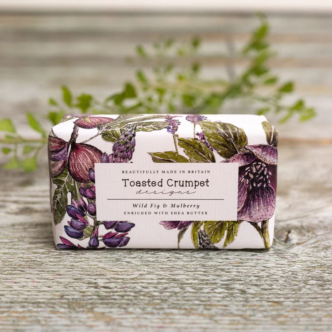 This 100% triple milled soap bar is made with traditional methods using pure vegetable oil, with a fig and mulberry scent, and is presented in a beautifully designed fully recyclable wrap. Proudly made in Britain. Enriched with Shea butter. Vegan friendly and not tested on animals. Paraben and SLS free.