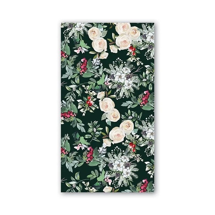 The first frost glitters softly against a blossoming backdrop of winter florals and English holly on these elegant napkins. These soft, triple-ply paper hostess napkins add an elegant and functional touch to any space or event.