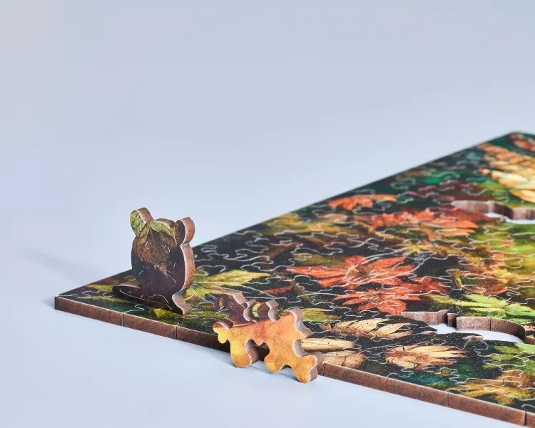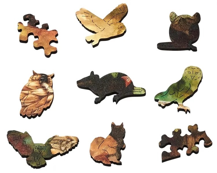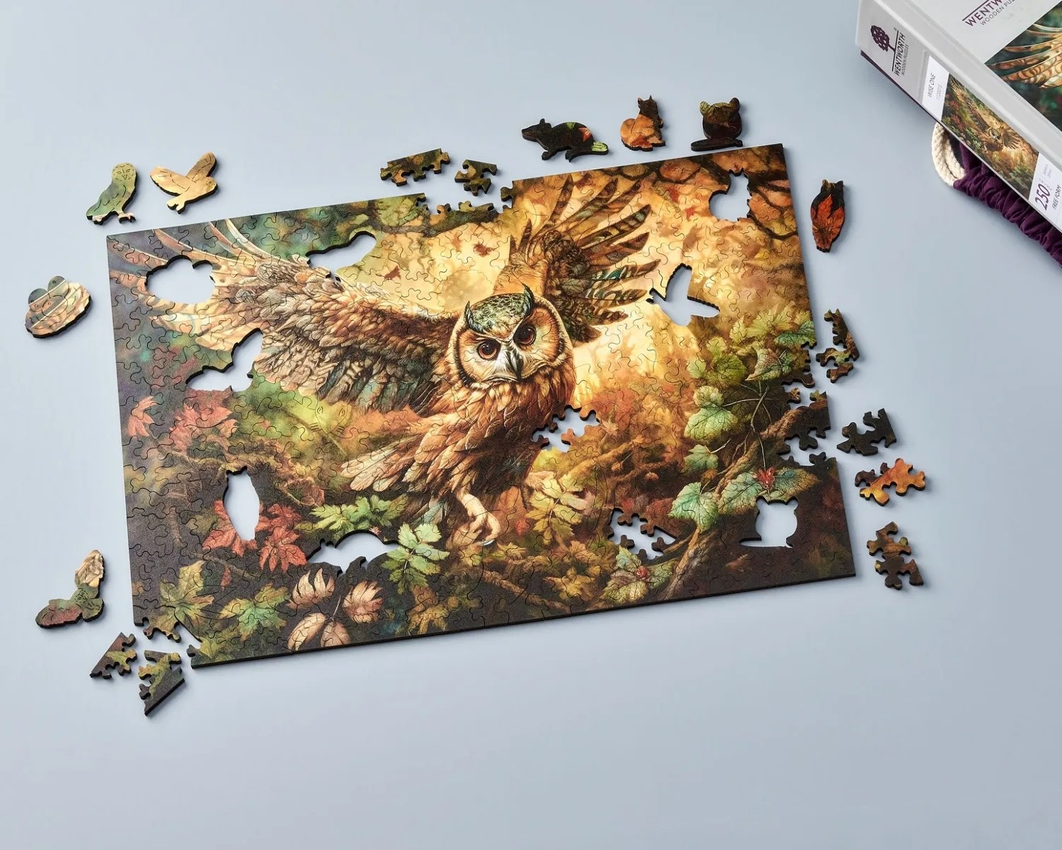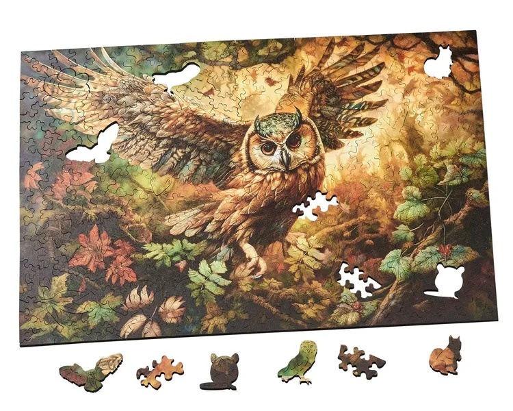 Enjoy piecing together this enchanting owl themed wooden jigsaw puzzle with unique shaped pieces and themed whimsies inspired by Claudia McKinney's owl-mazing artwork.