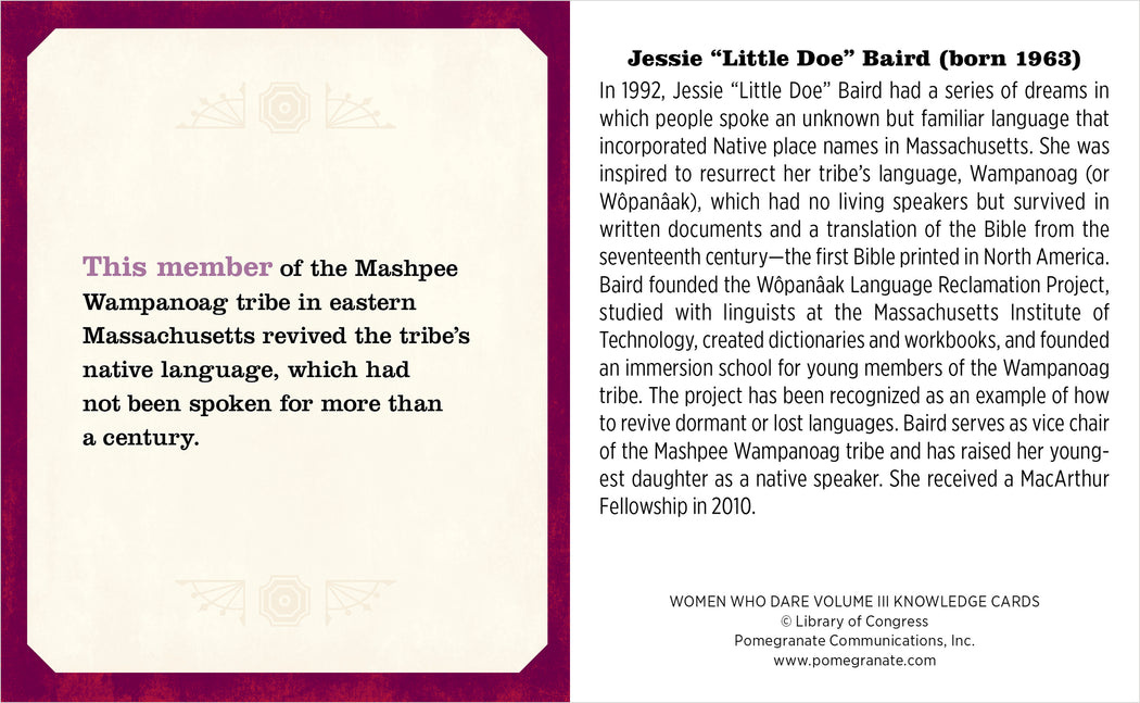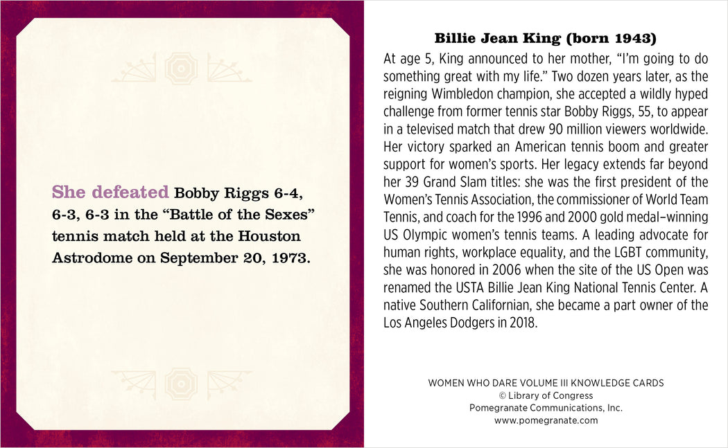 Despite often daunting barriers, the women featured here became significant achievers in fields ranging from the sciences to the arts, sports to entertainment, and journalism to activism. Their lives and accomplishments are celebrated throughout the vast collections of the Library of Congress, from which these 48 profiles are drawn. Each card in this deck presents an intriguing quote or morsel of information about a woman of consequence, along with a brief biography. From legal, cultural, and feminist icon Ruth Bader Ginsburg to trailblazing attorney Dovey Johnson Roundtree — daring women, we salute you. As Michelle Obama said, “The vision and perseverance of a single individual can help to turn the tides of history.”