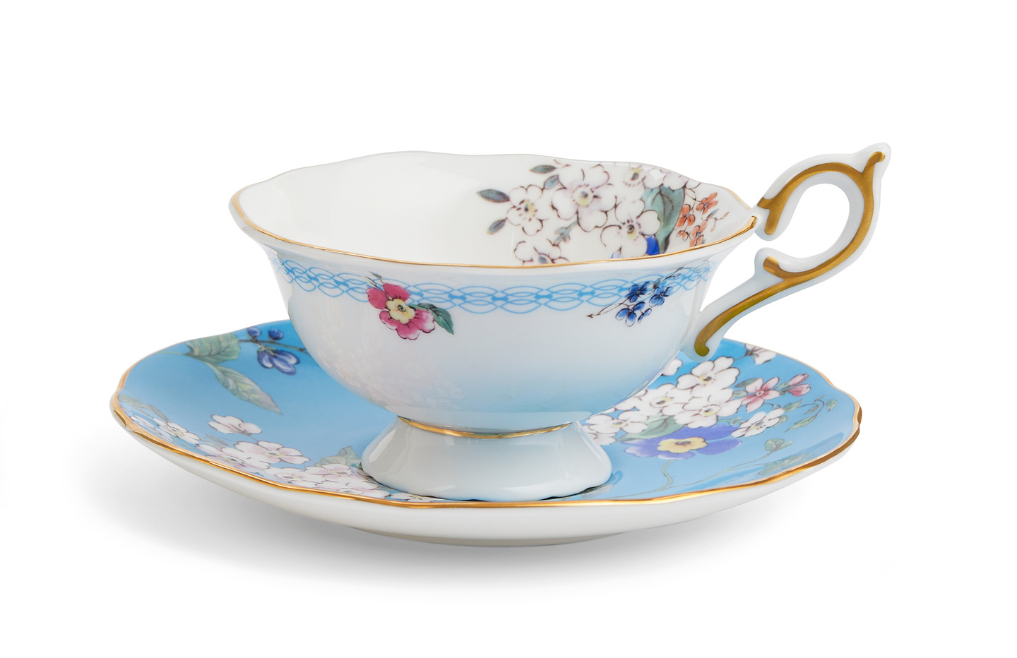 Enjoy a cup of tea from this elegant set and feel yourself transported to an English country garden from times gone by. Delicate white apple blossom dances across the turquoise-blue saucer and creeps into the pure white interior of the cup. Blue touches and luxurious gold decoration complete the delightful design, which is part of the eclectic Wedgwood Wonderlust collection. Dishwasher safe. Hand wash recommended.