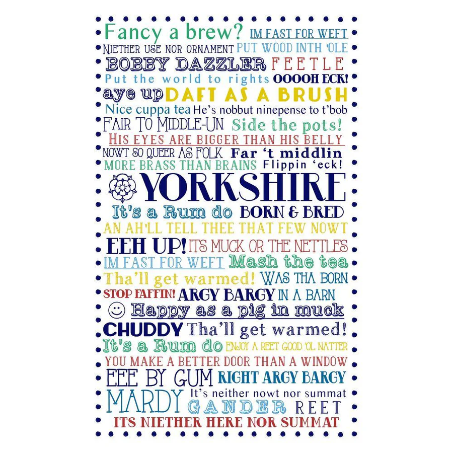 This comical design was inspired by the best people - those from Yorkshire. It features a variety of amusing well-know quotes from the area including: Daft as a brush, Fancy a brew?, and Happy as a pig in muck! The text is colored blue, green, brown and yellow and is framed by a cotton white background.